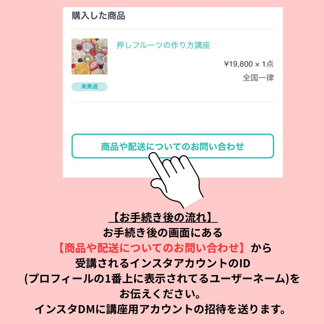 お手続き後、BASE(こちらのサイト)の【商品や配送についてのお問い合わせ】にて受講されるインスタアカウントのIDをお伝えください。